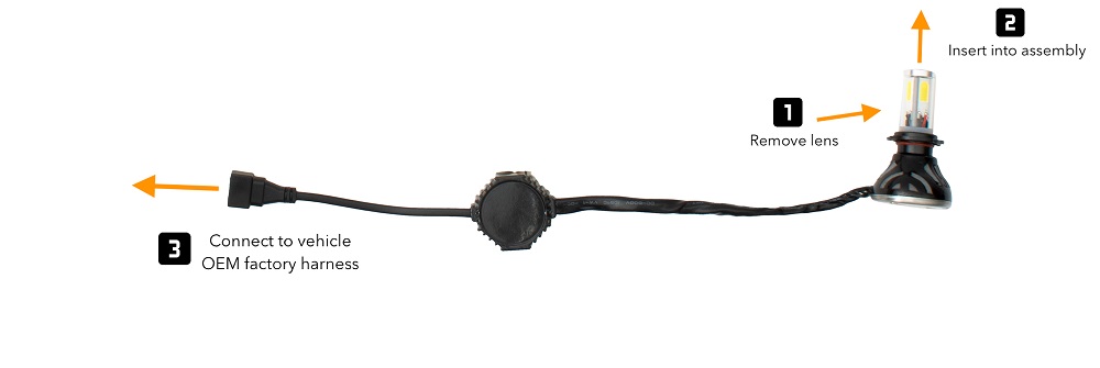 The LED bulbs will have an identical design to your halogen bulbs in terms of both the locking tabs and plugs. So the bulbs will lock in perfectly to your housing and connect right to your car or truck’s power harness.